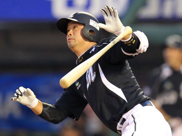 6番 里崎 右翼三 2-2からの5球目、外角低めのスライダーにバットを伸ばして逆方向にはじき返した打球は、ライト線いっぱいに落ちて、スライディングキャッチを試みたライトの横を抜けた!! 打った里崎は激走を見せて、3塁に滑り込む!! 里崎の2009年以来となる3ベースヒットでチャンスを作る!! |