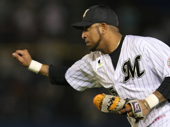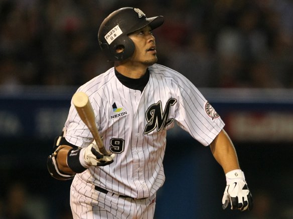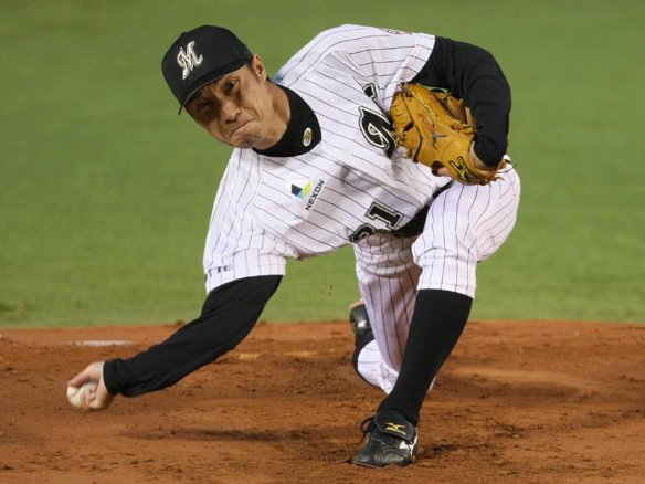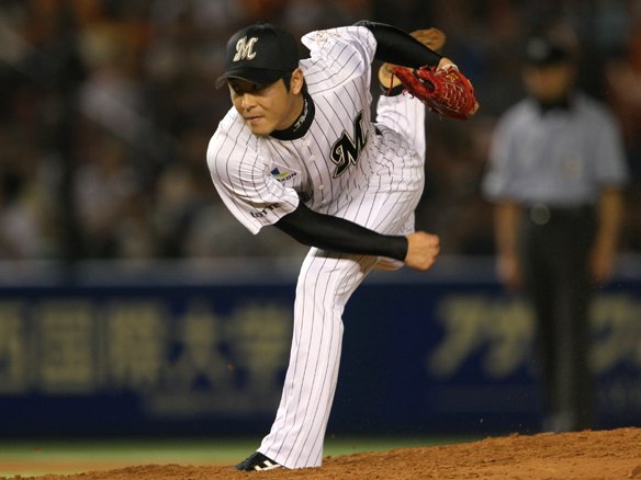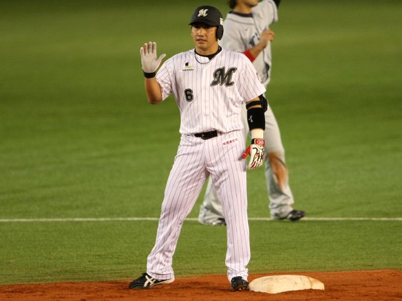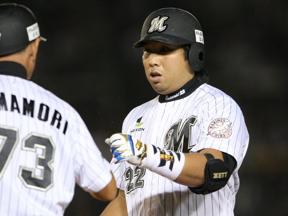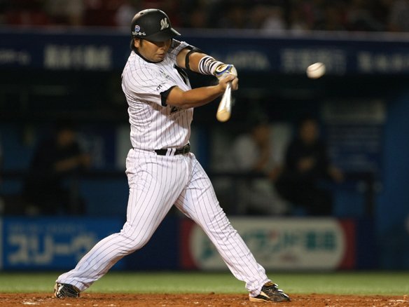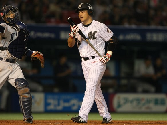 7番 里崎 右飛 1-2から外角高めのスライダーを右方向へ運ぶも、痛烈な打球はライトにキャッチされた。続けざまに1塁へ送球されるが、1塁ランナー・福浦が素早く1塁へ戻った。 |