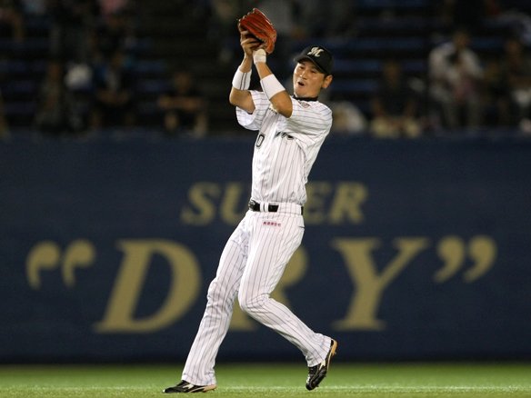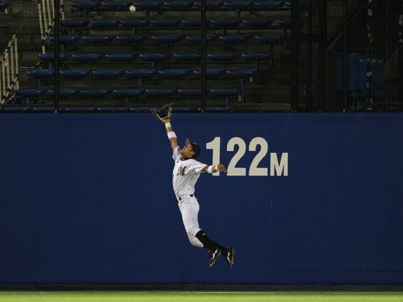 フェルナンデスのフライをガッチリ捕球する渡辺正