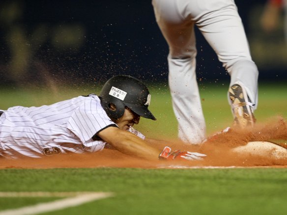 工藤は勝利への執念を前面に出し1塁へヘッドスライディング!