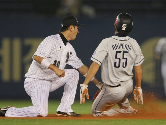3番 井口 左安 2-0からけん制されて1塁ランナー・工藤が戻るが、ファーストが送球をつかめずにボールが後方へ転がっていく! 工藤は2塁を狙い、最後はヘッドスライディングして到達した! ファーストにエラーが記録された。 ![]() 2