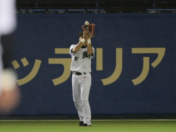 4番 山崎 中飛 1-1から外角へのスライダーを打ち返された打球はセンター前へ。しかし前方へダッシュするセンター・岡田が落下点へ飛び込み、グラブの先で打球をつかんだ! |