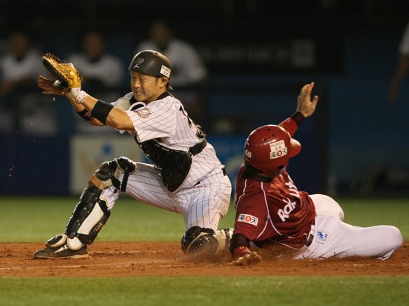 9番 聖澤 投犠 0-1からやや高めのスライダーをバントされたゴロは高く弾んで1塁方向へ。ピッチャーが拾って1塁へ送る間に2塁ランナーは3塁へ進んだ。送りバント成功。 |