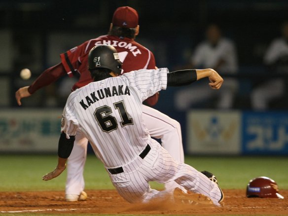 9番 聖澤 一ゴ 1-1から外角へのシュートで引っ掛けさせたゴロはファーストがつかみ、素早く1塁を踏みにいった。 |