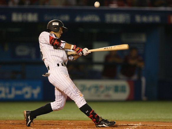 投手 塩見 7番 角中 左中二 1-1から外角低めのストレートを逆方向へ運ぶと、打球は追い掛けるレフトの頭上を越えて弾み、フェンスに到達! 打った角中は2塁を陥れた! |