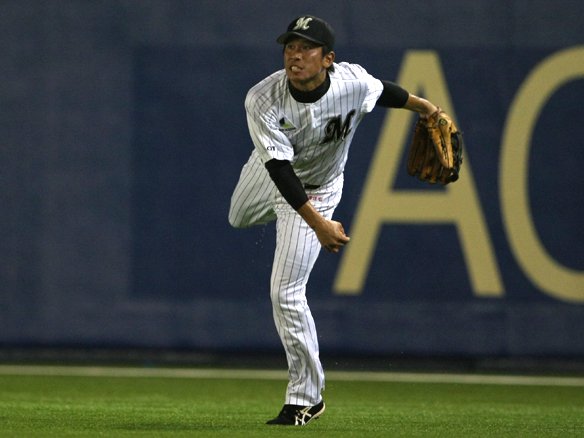 5番 井口 中飛 0-2からの3球目、外角低めのフォークボールを芯で捉えた打球は、センターの後方に伸びていく。しかし、背走しながらフェンス手前でジャンプしたセンターに好捕されてしまった。 |