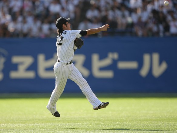 5番 バルディリス 左翼二 初球の内角低めのストレートをたたかれると、打球は飛びついたサードのグラブの脇を抜けていった。レフトが回り込んで打球を処理する間に、2塁ランナーにホームにかえられ、2対1。1塁ランナーに3塁へ進塁されると、打ったバルディリスも2塁へ。 ![]() 3