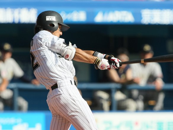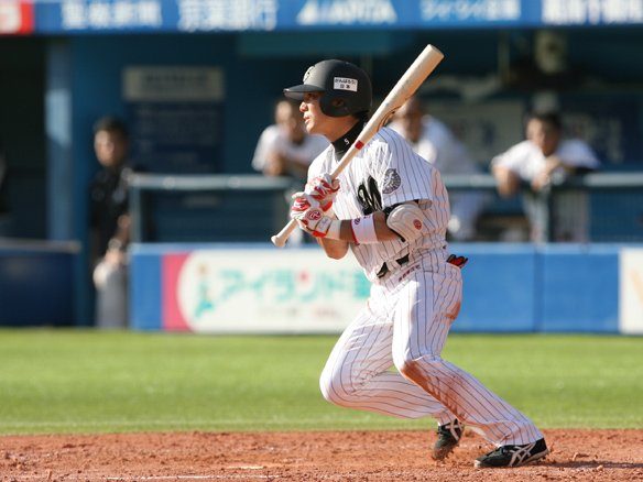 投手 木佐貫 9番 根元 左越二 1-0からの外角のストレートを流し打つと、高く上がった打球は風に乗ってレフトの頭上を越えていった! フェンスに到達する間に、打った根元は2塁へ! |
