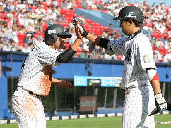 スクイズを成功させた塀内と生還した角中がハイタッチ!
