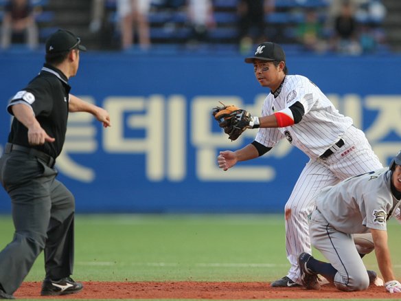6番 李スンヨプ 二ゴ 1-2からの外角低めの変化球を打たせると、高く弾んだ打球はセカンドへ。ホームを見るも間に合わず、1塁へ送球した。3塁ランナーにかえられ、2対2。2塁ランナーは3塁へ到達。 ![]() 3
