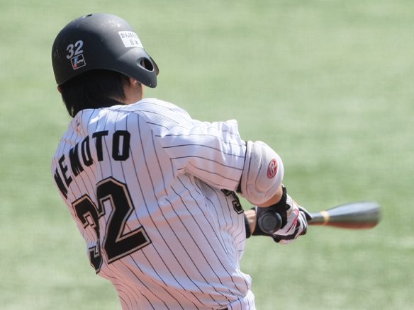8番 上本 左安 1-2からの外角低めのストレートを流し打たれると、ライナー性の打球はショートの頭上を越えていった。レフトが回り込んで処理する間に、1塁ランナーが3塁へ到達。 |