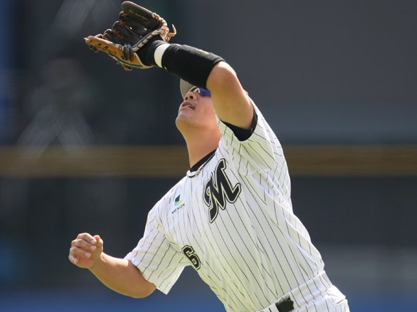 6番 角中 投ゴ 0-1からの外角低めのフォークに体勢を崩されると、力無く転がった打球をピッチャーにマウンド上で捕球された。 |