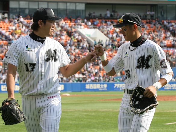最後まで諦めない執念が実り、井口に同点タイムリーヒット、福浦に勝ち越しタイムリー2ベースヒットが飛び出しました!! 最終回を全員で守り抜き、久々の勝利の瞬間を迎えたい!! |