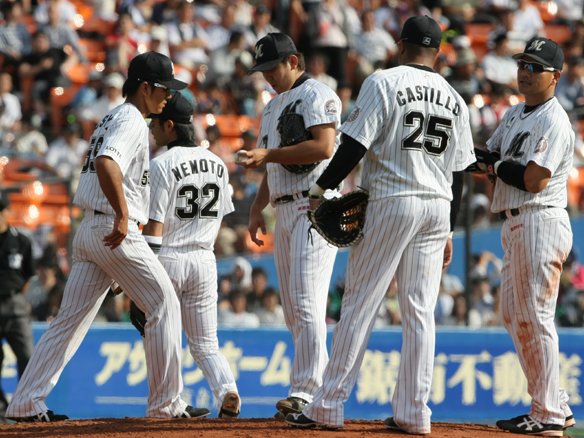 ピンチの場面にマウンドに集まるマリーンズナイン