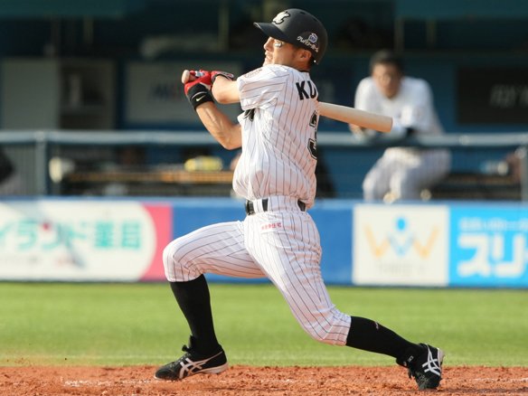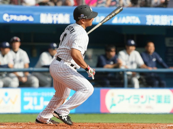 5番 井口 左安 0-1からの真ん中低めのストレートを巻き込むようにたたくと、ライナー性の打球はレフトの前で弾んだ! これで井口は2試合連続複数安打を放った! |