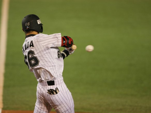 9番 山崎 投犠 初球、高めのストレートをバントされて正面へ転がるゴロとなる。ピッチャーが拾って1塁へ送る間に、1塁ランナーが2塁へ進む。送りバントを成功された。 |