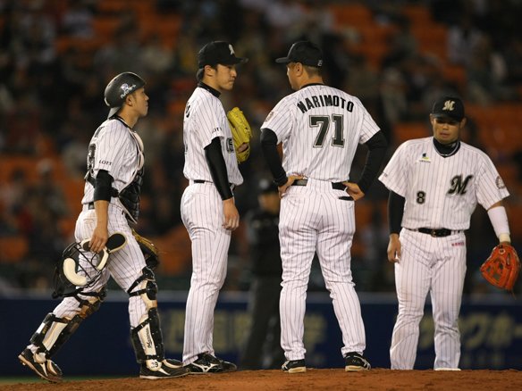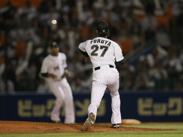 5番 長谷川 2-2から低めのスライダーで打ち損じさせるも、高く弾むゴロは二遊間へ。セカンド・井口が回り込んでボールをつかみ、向き直りながら1塁へ送球! 間一髪でアウトに仕留めた! この間に2塁ランナーは3塁へ進む。 |