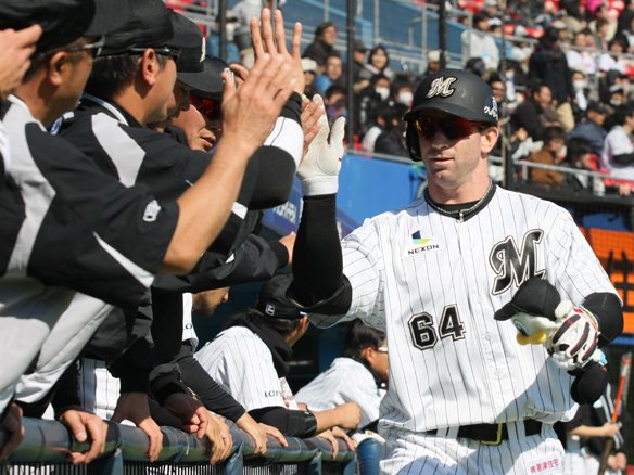 開幕に向けて、連投テストとなったルーキー・益田。先頭のテレーロにデッドボールを与えましたが、3人で切り抜けました! グラブタッチを交わしながらベンチに戻ります! |