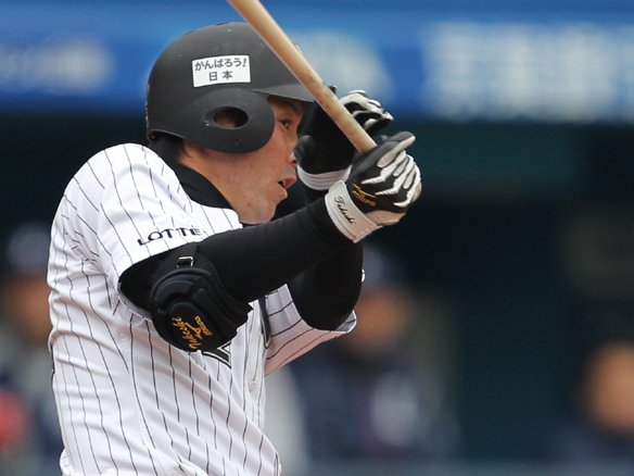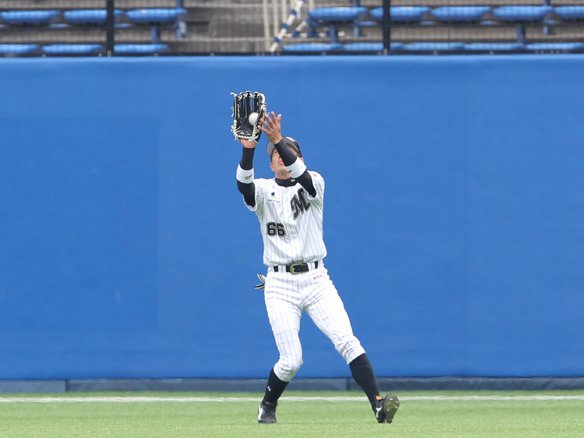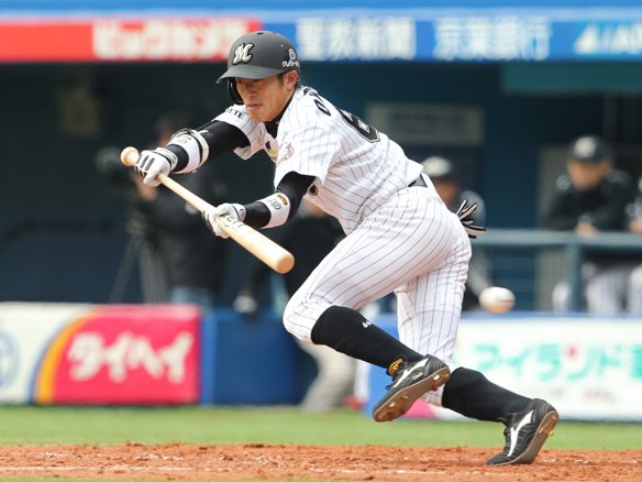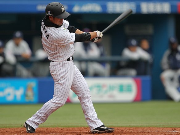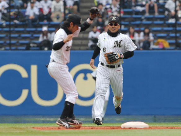 8番 里崎 左飛 初球、外角高めのストレートを捉えた打球は左中間の深いところへ飛ぶ。しかし、落下点へダッシュするレフトに滑り込みながら捕球された。 |