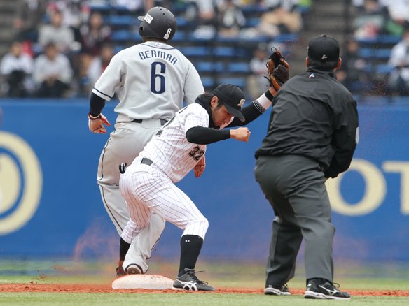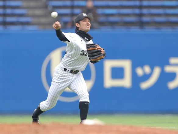 投手 成瀬 1番 ヘルマン 左安 2-1から内角寄り高めのストレートを引っ張られると、球足の速いゴロが三遊間へ。打球は飛び込むショートのグラブをかすめてレフト前へ転がっていった。 |