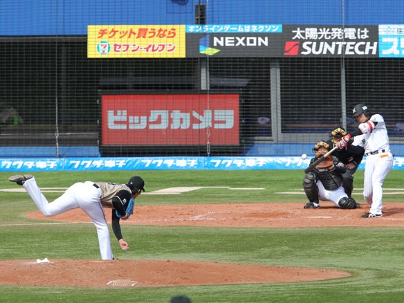岡田がフォアボール、根元がヒットで出塁しましたが、相手先発・吉川の前にあと一本が出ませんでした。試合開始直後は雨が降っていたQVCマリンですが、今はすっかり晴れ上がり選手たちを優しく照らし続けています! |