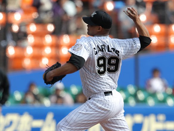 藤岡の後を受けマウンドに上がった2番手・カルロス・ロサは満塁のピンチを迎えましたが、最後は代打・二岡を打ち取り無失点でしのぎました! |
