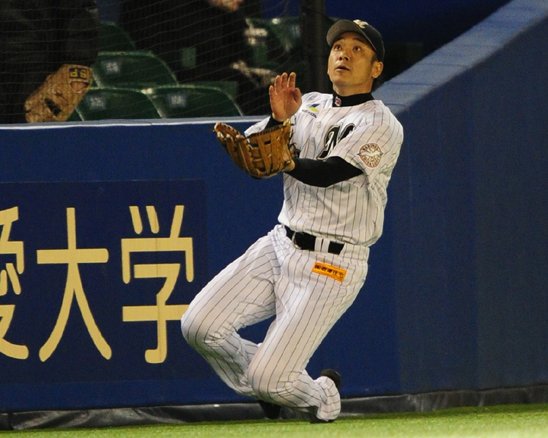 スライディングキャッチを試みるサブロー