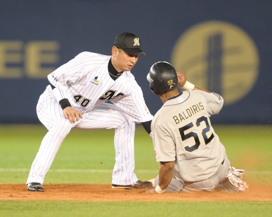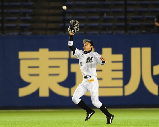 3番 後藤 二ゴ 初球、高めのボールを打ち返されて一二塁間への球足の速いゴロとなるが、セカンド・井口が腰を落として滑り込みながら捕球! 余裕を持って1塁へ送球した! |