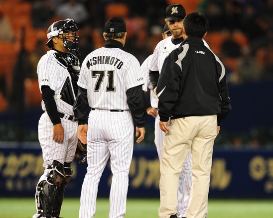得点圏に走者を置く場面で西本コーチがマウンドへ