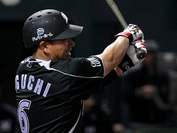5番 サブロー 左越二 2-2からの6球目、真ん中のストレートをはじき返した打球は大きな弧を描き、フェンスの最上部を直撃! 打ったサブローは悠々と2塁に到達した! |