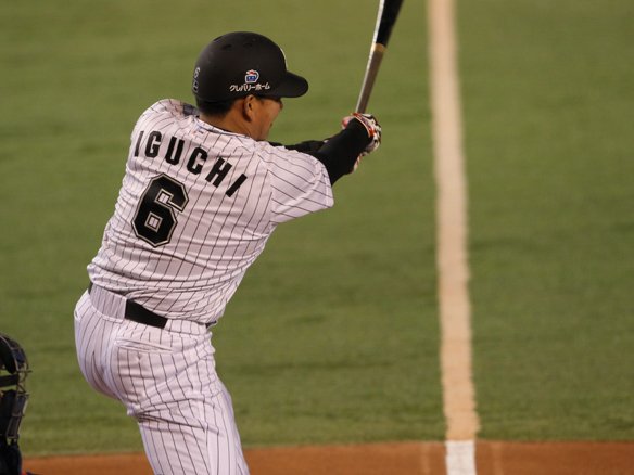 3番 井口 右安 1-0から内角のストレートを振り抜き、打球は詰まりながらもセカンドの後方に落ちた! 1塁ランナーは2塁を蹴って3塁を陥れる! 井口はこれで4試合連続ヒット! |