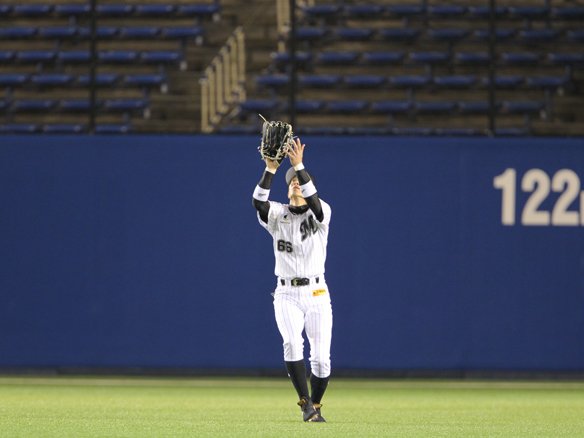 投手 成瀬 9番 星 左飛 2-2から真ん中低めのチェンジアップをすくい上げられ、ライナーとなった打球はレフトが定位置でキャッチした。 |