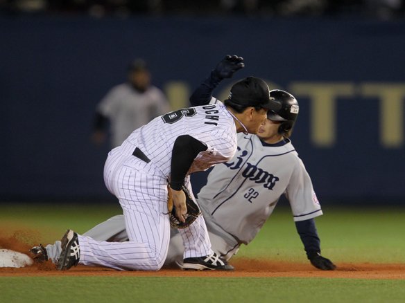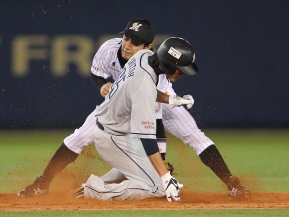 盗塁に対し田中が素早く送球するもセーフ