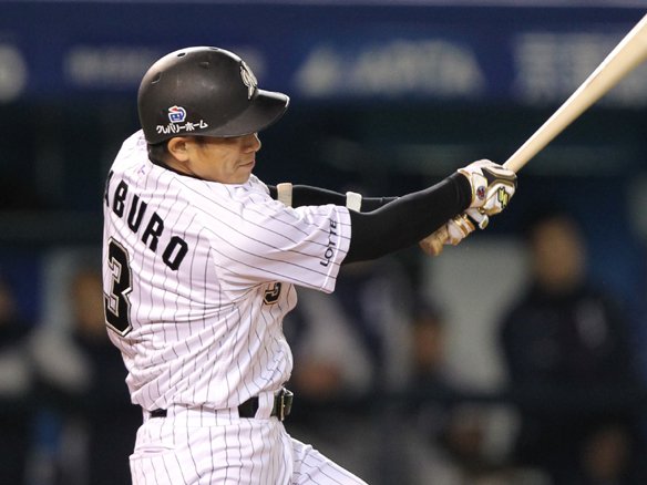 フェンス直撃の二塁打を放つサブロー!