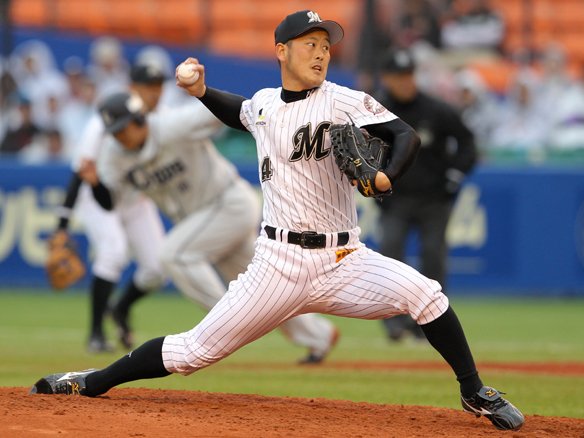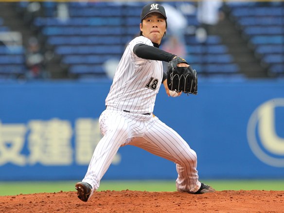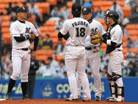 投手 西口 5番 福浦 一ゴ 1-0から外角低めのチェンジアップを引っ掛けた打球は、ファーストが拾い上げて1塁ベースカバーに走り込むピッチャーにトスされてしまった。 |
