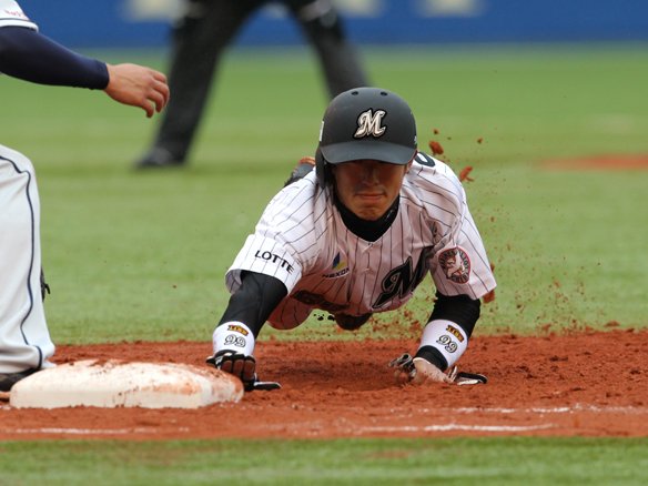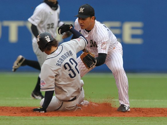 5番 ヘルマン 二ゴ 1-0から外角寄り高めのストレートをピッチャー返しされた球足の速いゴロは、センターに抜ける寸前でセカンド・井口がダイビングキャッチ。そのまま2塁ベースカバーに入ったショートへトスして、1塁ランナーをフォースアウトにした! |