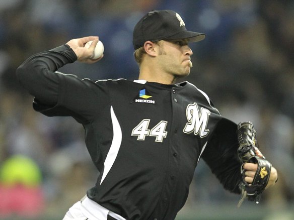 投手 八木 8番 里崎 左飛 初球、外角低めのシンカーをバットの先で捉えた打球は、良い角度で上がったものの伸びが足りず、ウォーニングゾーンの中で構えるレフトに捕球されてしまった。 |