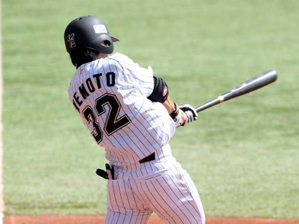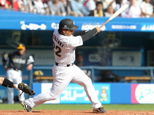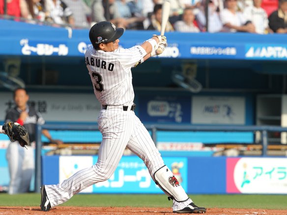4番 サブロー 四球 フルカウントから真ん中低めに投じられた緩いカーブにバットがピタッと止まった! これでサブローは15試合連続出塁! |