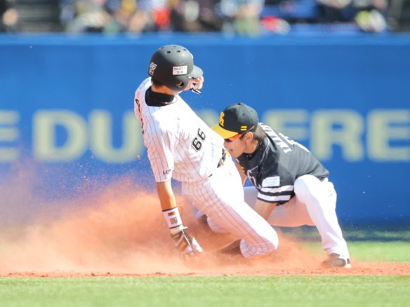 岡田が盗塁を仕掛けるもわずかに及ばず