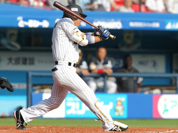 投手 攝津 1番 岡田 二安 1-1から真ん中のシンカーをたたいた打球は、一二塁間の深い位置に転がった。セカンドが捕球し1塁へ送球するが岡田の俊足が勝った! 岡田はこれで6試合連続ヒット! |