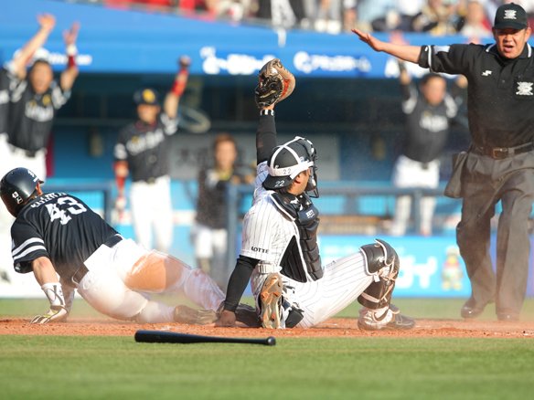 8番 里崎 右安 0-1から1塁ランナー・清田がスタート。キャッチャーからの送球はワンバウンドとなり、清田はタッチをかいくぐり2塁へスライディング! 清田は今季3個目の盗塁成功! ![]() 1