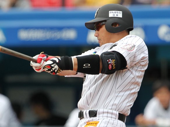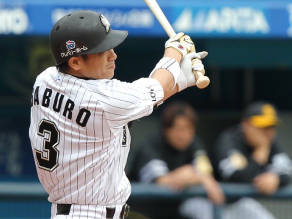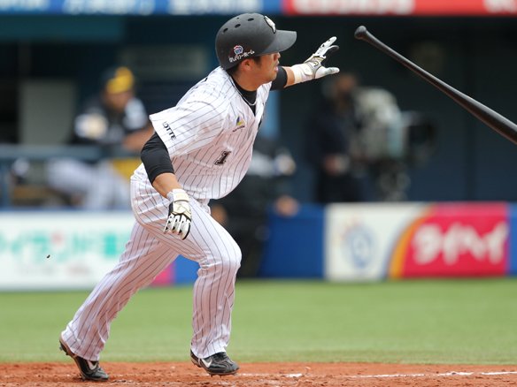 4番 サブロー 左安 1-0から内角のカーブをうまくバットに乗せた打球は、ライナーとなってレフトの前で弾んだ! |
