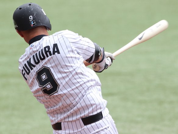 5番 福浦 左安 2-1から真ん中のストレートをおっつけた打球は、詰まりながらもレフトの前で大きく弾んだ! |