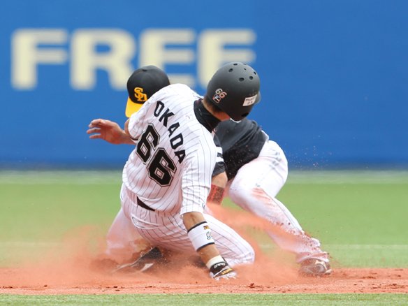 2番 根元 空三振 1-0から1塁ランナー・岡田がスタート。キャッチャーからの送球をかいくぐって2塁に滑り込んだ! 岡田は今季6個目の盗塁成功! |