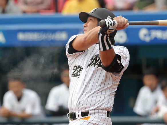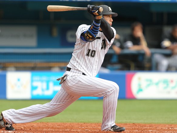 4番 サブロー 中安 3-1から内角のストレートをはじき返し、打球は鋭い当たりとなり飛び込んだショートの右を破ってセンター前に抜けていった! |