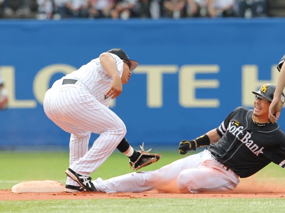 鋭い送球を受けた井口がタッチして盗塁阻止!