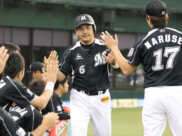 5回表に痛恨の走塁死を喫したキャプテン・今江が、バットで取り返す! 来日初登板の長身左腕・ウィリアムスから、勝ち越しの一打を放ちました! |