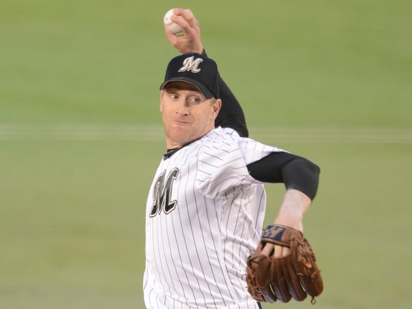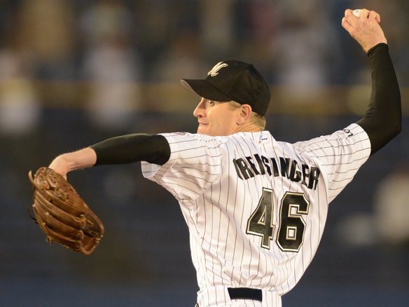 グライシンガーは初回に続き、この回もランナーを置いた状況で田中賢を迎えました。しかし、4月24日の対戦では4打数4安打されたこの巧打者を打ち取り、得点を与えません! |