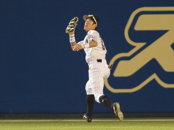 抜群のスタートでフライを難なくキャッチする岡田!