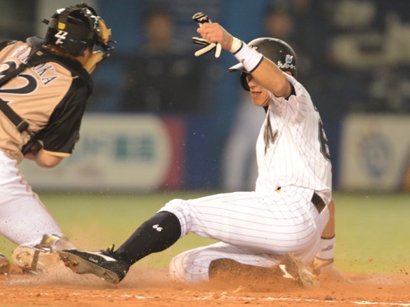 8番 里崎 中飛 1-1からの3球目、真ん中低めにワンバウンドしたフォークボールが、キャッチャーの足の間を抜け、バックネットに到達。キャッチャーが行方を見失っている間に、2塁ランナーが一気に3塁を回って本塁に滑り込む好走塁! 2対8。ワイルドピッチが記録され、1塁ランナーも3塁に進んだ。 |